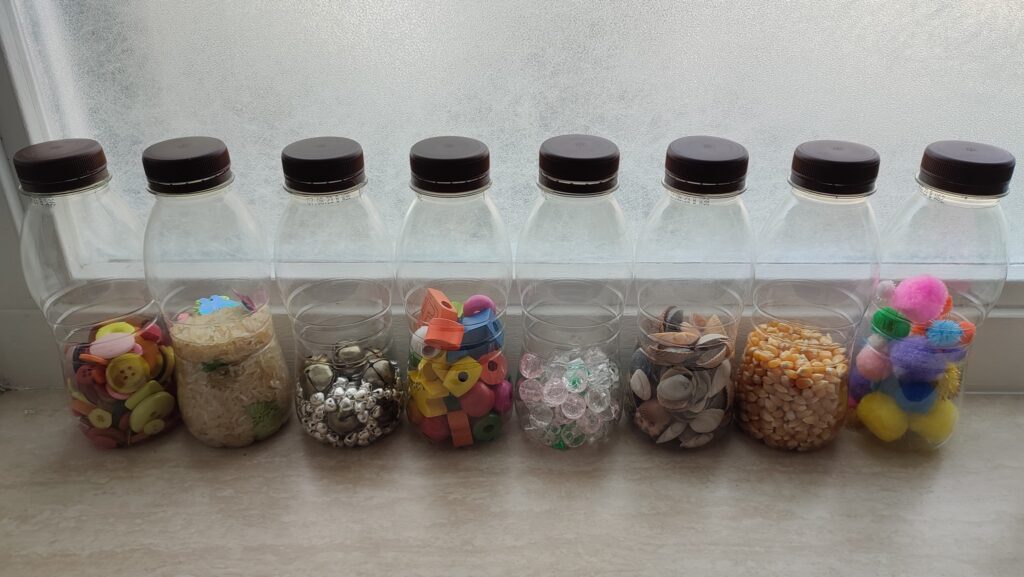 I.p.v. ze te kopen, heb ik nu lege flesjes van 330ml schoongemaakt en deze gevuld met dingetjes die de zintuigen aanspreken qua geluid, vorm, kleuren en gewicht. Ik heb nu 330ml flesjes gepakt omdat ik die al had, maar ze mogen voor mij persoonlijk ook minder inhoud bevatten. Dan nemen ze ook meteen minder plaats in en het effect zal vast hetzelfde zijn. Maar dat moet ik nog gaan uitproberen! Wellicht zijn deze zintuig flessen meer iets voor de hele kleintjes, maar nu zijn ze ook meteen gespreksstof voor de peuters